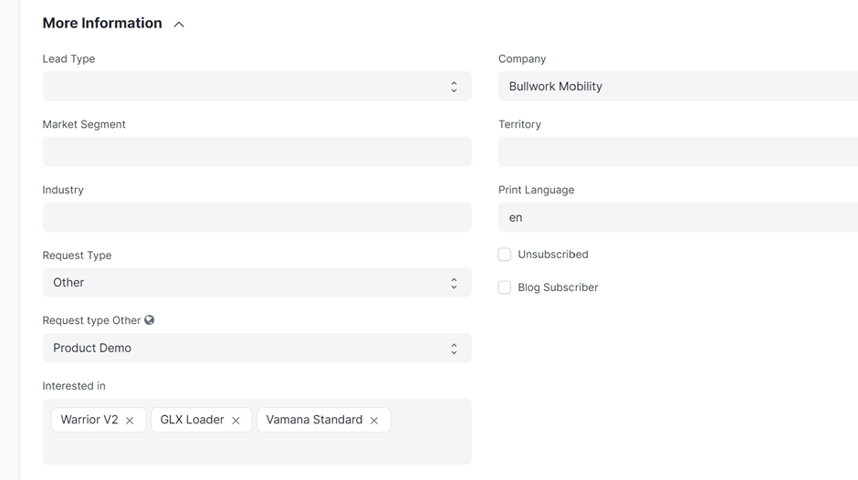 2. Field ‘Interested In’ is introduced for capturing the products which the prospective customer is interested in: