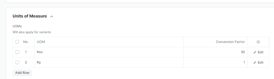 When creating a Variant of Raw material using the template in Production, care should be exercised to calculate the weight of the material for the variant dimension, profile, specific weight of the material type. Maintain this as conversion factor for UOM ‘Nos’ row under Unit of Measurement block in Item master. This weight should be always in ‘Kgs’ only. If correct conversion factor is not maintained may lead to over/under stocking of the material. NOTE: Conversion factor for row having UOM as ‘Kg’ should always be 1.