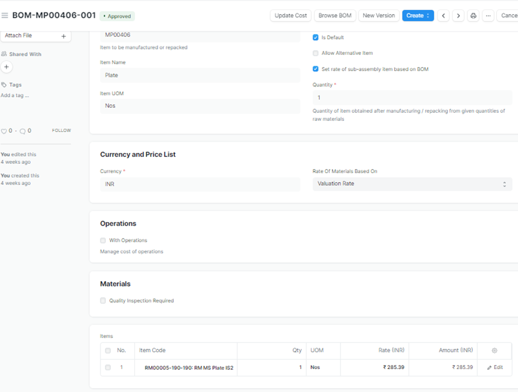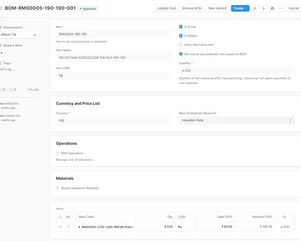 This Raw material variant will be the child part directly for a Manufactured part, where the quantity will be weight in kgs arrived at for the length required for making one number of Manufactured part. The header level quantity will always be 1 Nos.