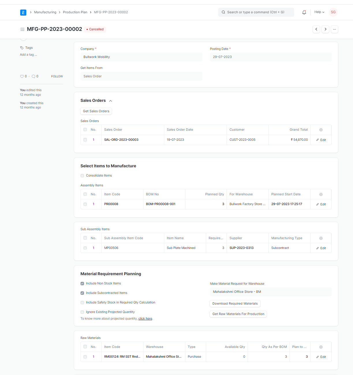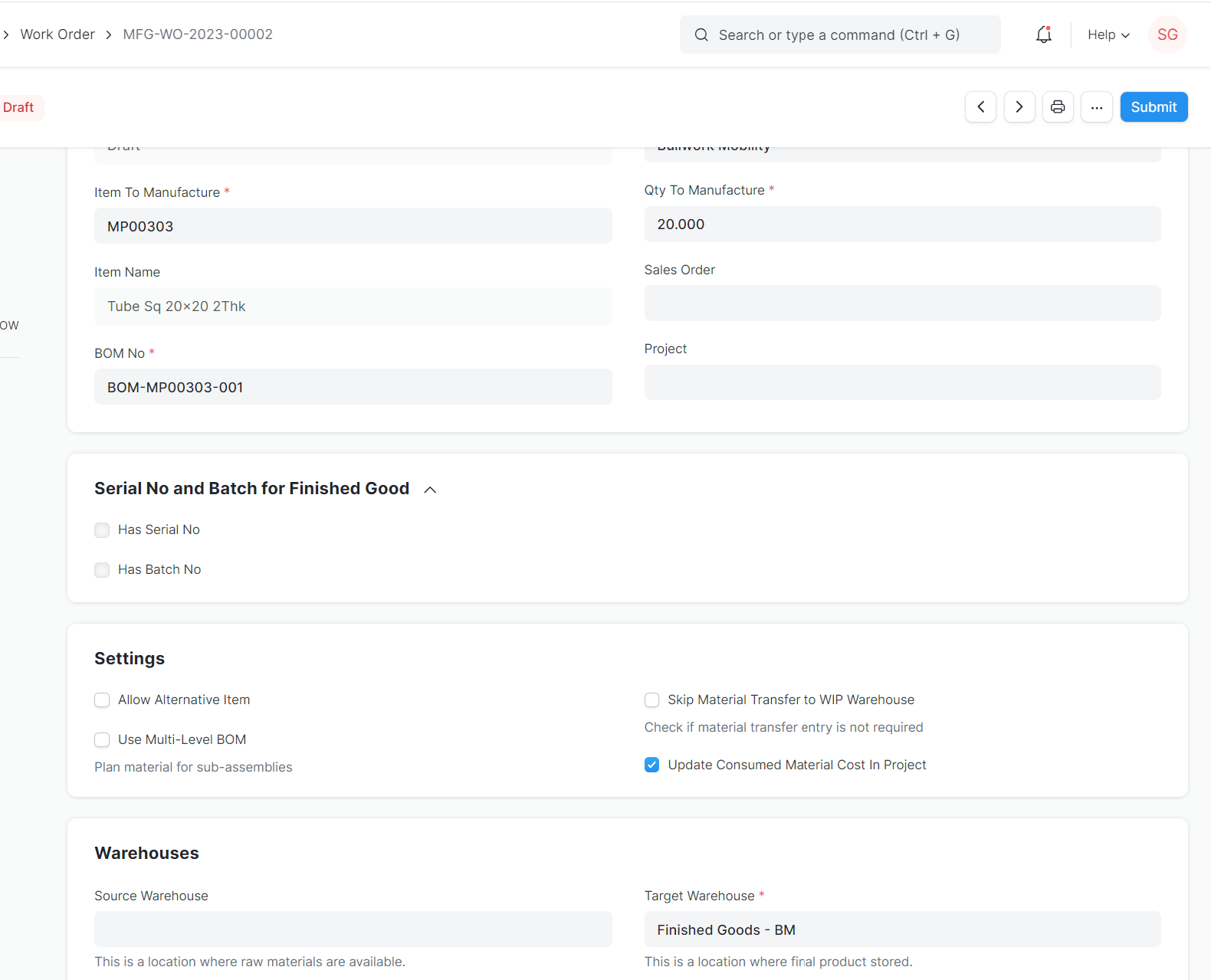 Further when product BOM is firmed up in the ERP, the manufacturing process in-house will be through production planning tool where workorders get created for each item.