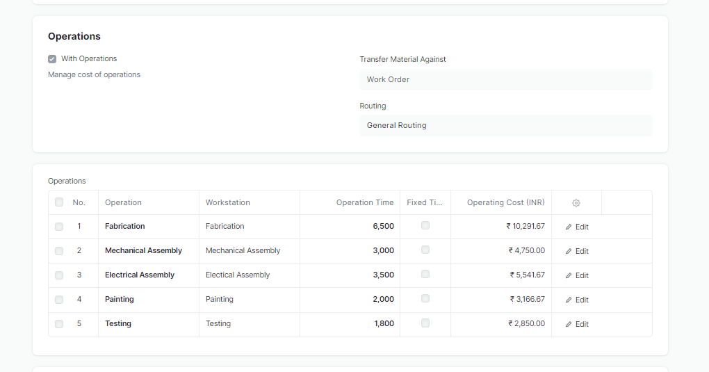 All items being manufactured in-house are covered under the item groups 'MP: Manufactured Part', 'SA: Sub-Assembly'. These items will be invariably having Bill of Materials (BOM) consisting of Raw material for Manufactured parts and one are more items (SP, BP, SA, MP) for Sub-Assembly items along with quantity required to manufacture one number of the higher level item. These items will also have operations defined in BOM. The operations can be created individually along with workstation and planned timings maintained or copied from a template. A common template consisting of Fabrication, Assembly, Electrical Assembly, Painting and Testing is available to be used for BOM.